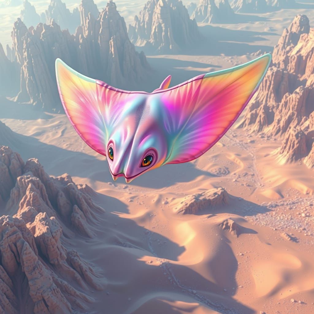 A breathtaking view of majestic, iridescent, pastel rainbow Crystal Skimmers soaring over the Crystal Sea. The image blends fantasy and realism with intricate textures and luminous colors.