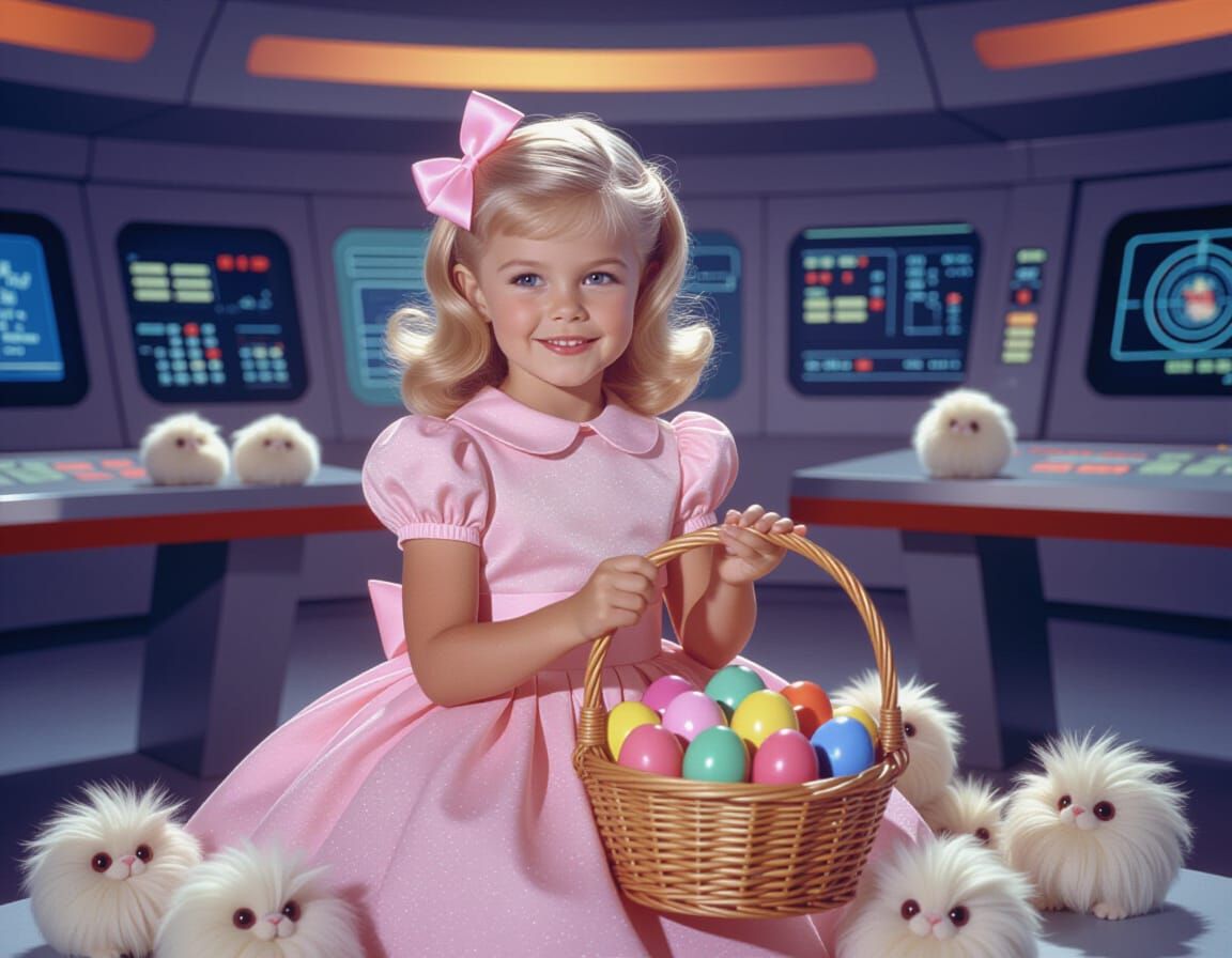This image shows a blonde girl in a pastel Easter dress holding an egg basket surrounded by Tribbles. The scene is set on a Star Trek bridge, with pin-up style art and whimsical charm.