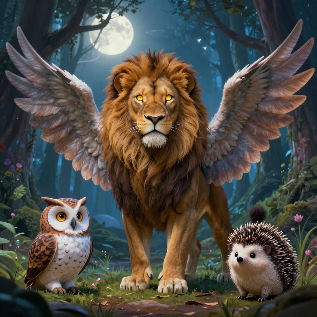 This image showcases a mythical beast combining lion, owl, and hedgehog features, set in a moonlit, magical woodland. Rendered in a vibrant fantasy art style with glowing eyes.