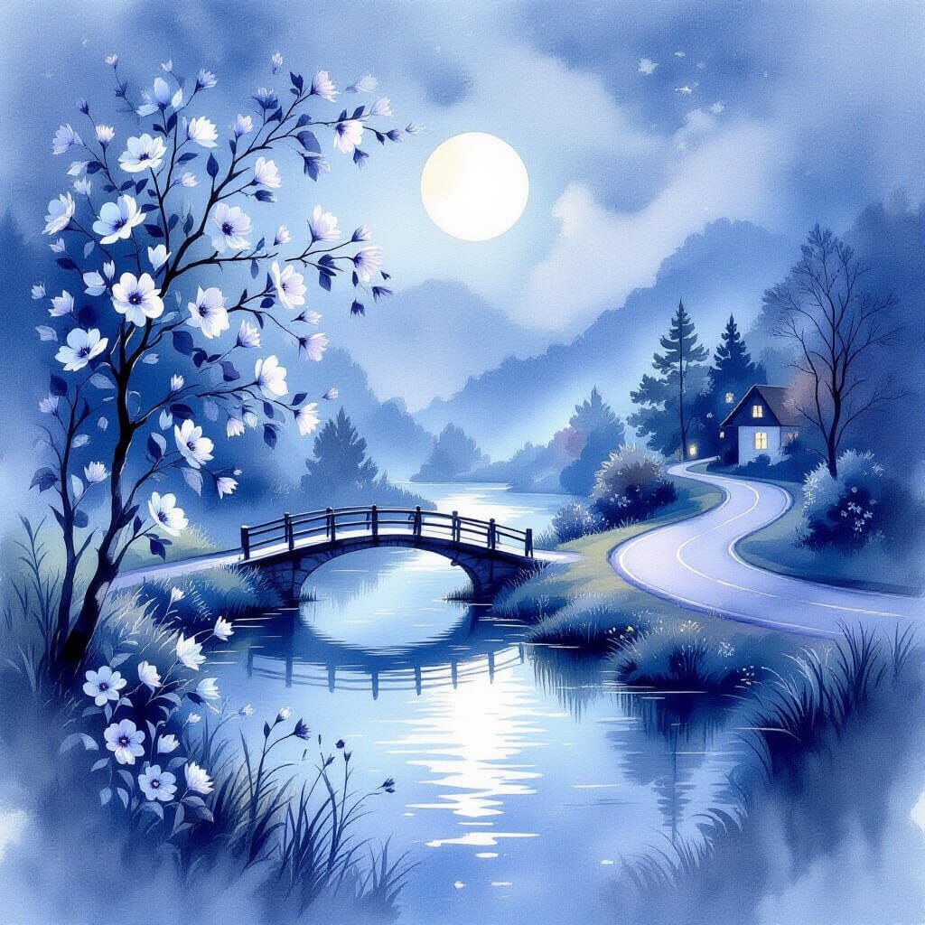 This AI-generated image showcases a serene night landscape with delicate flowers by a river, a small bridge, and a winding road, rendered in a dreamy watercolor style with soft gradients and elegant brush strokes.