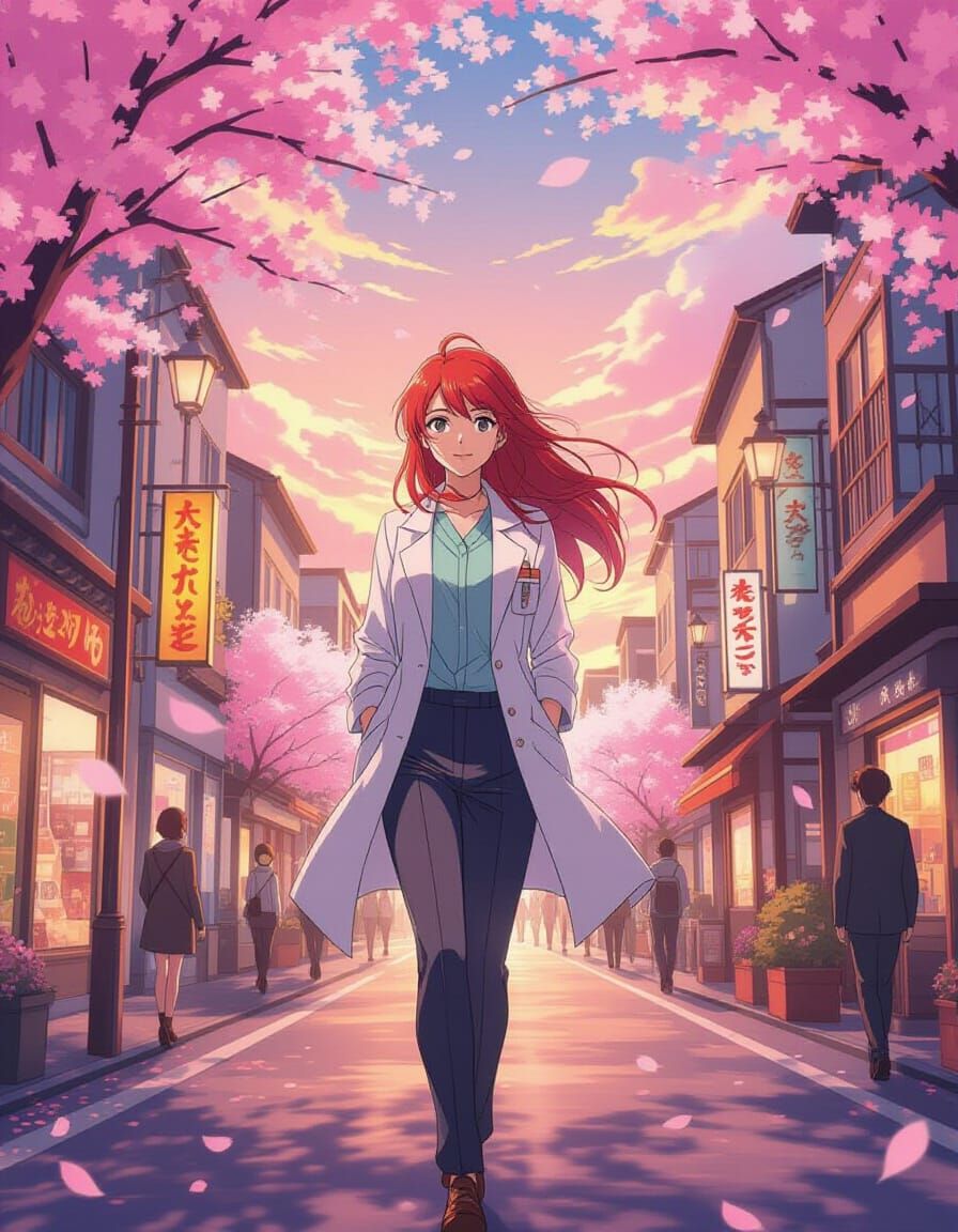 Generate your own anime doctor images with red hair walking through cherry blossoms. Free and easy AI image creation.