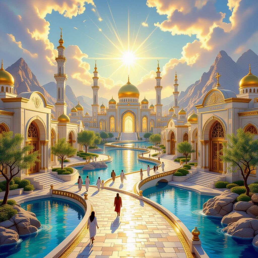 Generate stunning cityscapes inspired by divine light and golden streets. Try our free AI image generator today!