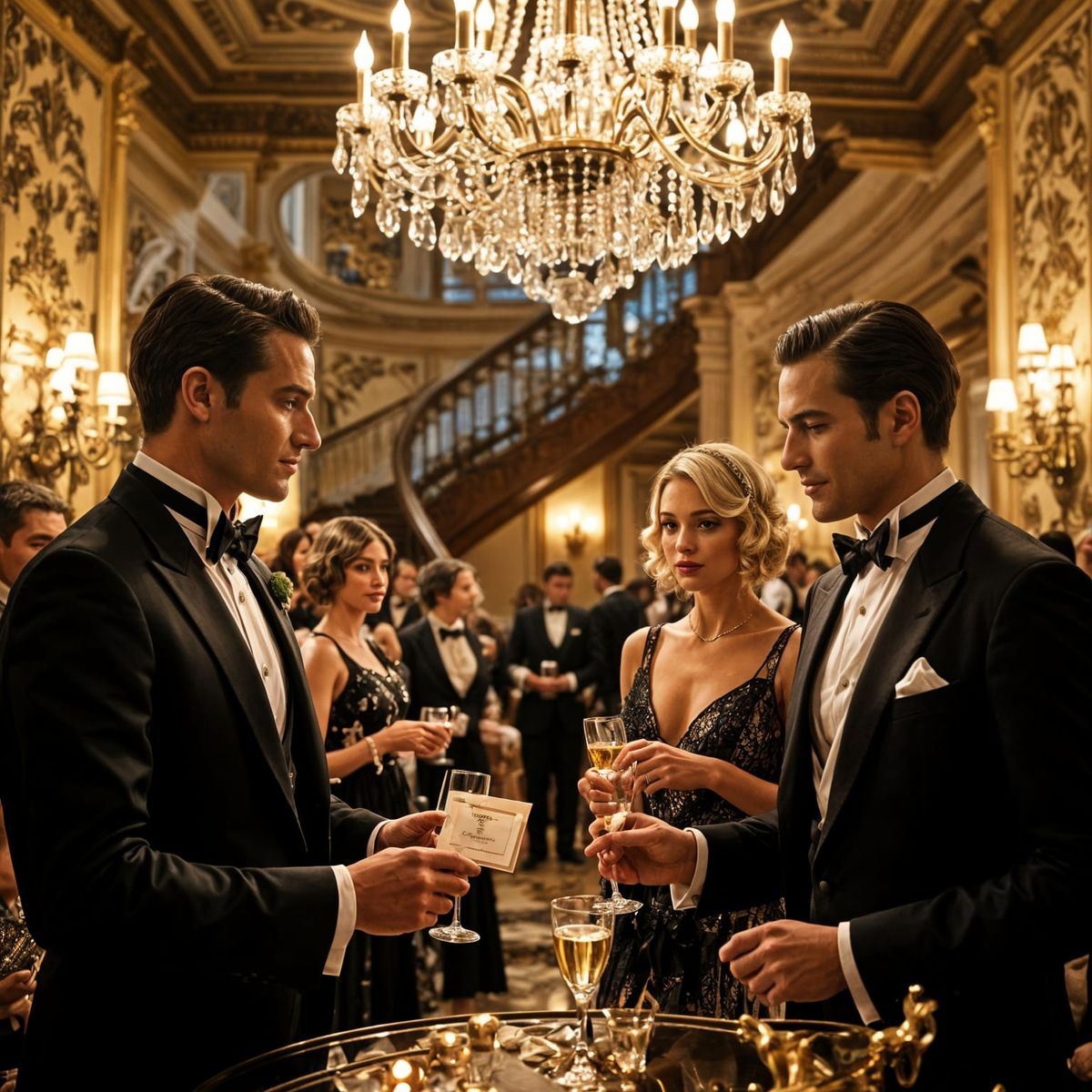 This image captures a glamorous 1920s perfume launch party in a luxurious mansion. Detectives in sharp suits arrive as guests mingle, served champagne by a butler. The scene evokes vintage elegance and high society.