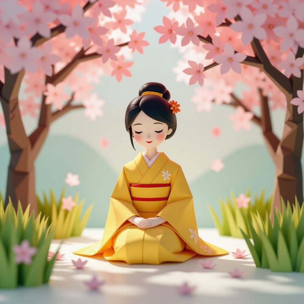 This image showcases a serene origami-style girl in a yellow kimono, seated beneath blooming cherry trees. The scene is crafted from folded paper art, featuring a gentle pastel palette and harmonious Japanese aesthetic.