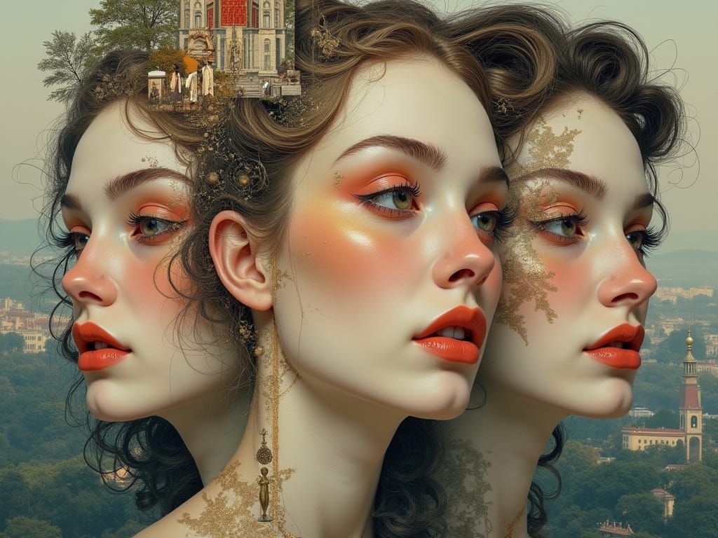 This image showcases a surreal collage of three intricately detailed women's faces, blended with architectural and landscape elements. It features rich textures, muted colors with gold accents, and a dreamlike atmosphere.