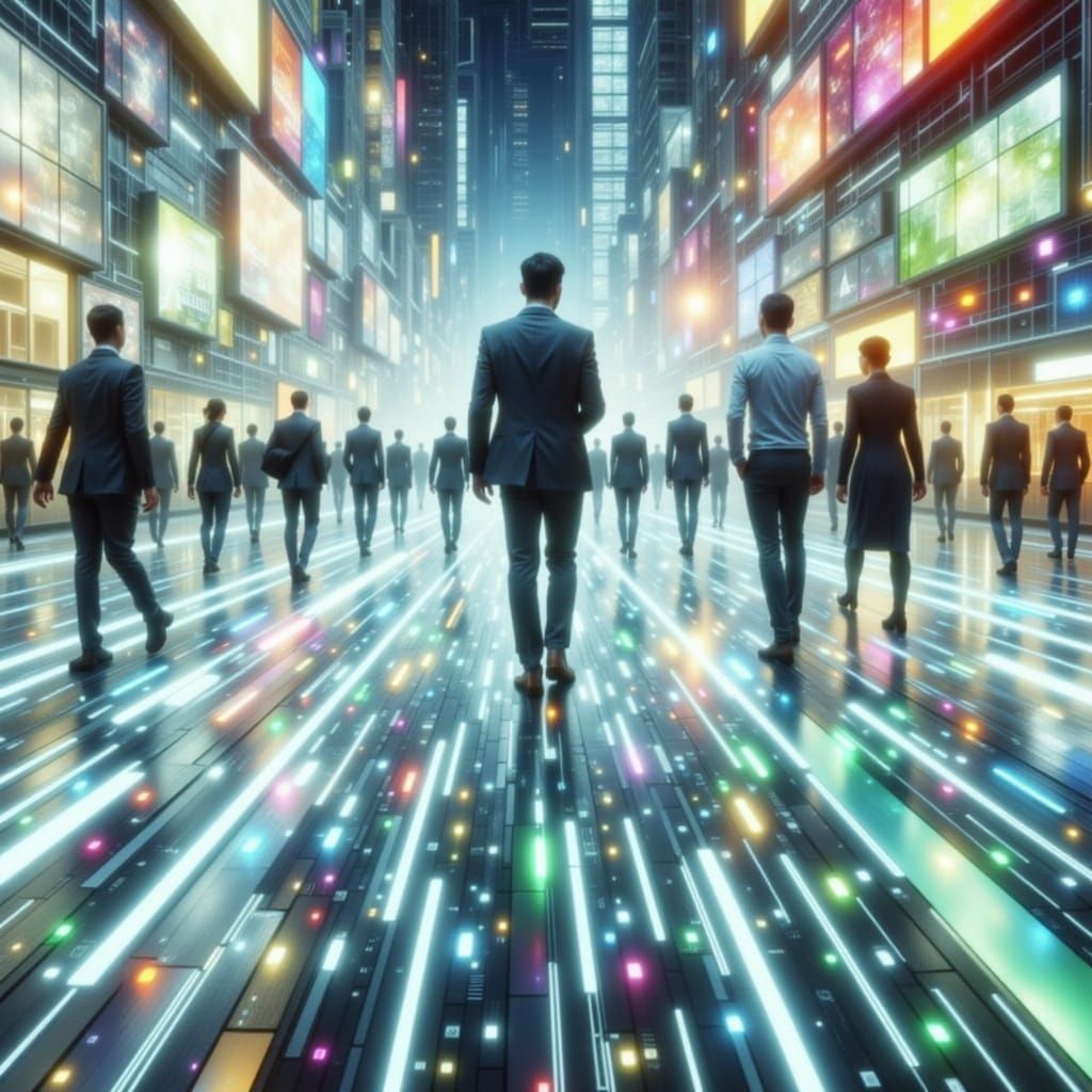 Generate unique digital street art featuring holographic math equations and geometric buildings. Try it free!