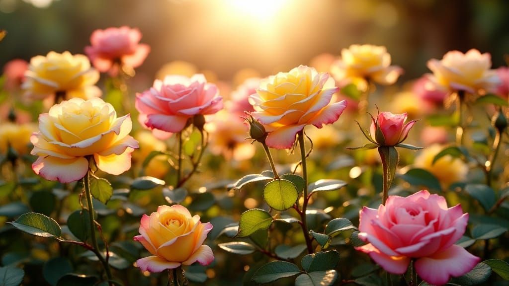 A serene rose garden scene from early morning, bathed in warm golden light, featuring a mix of yellow and pink roses.