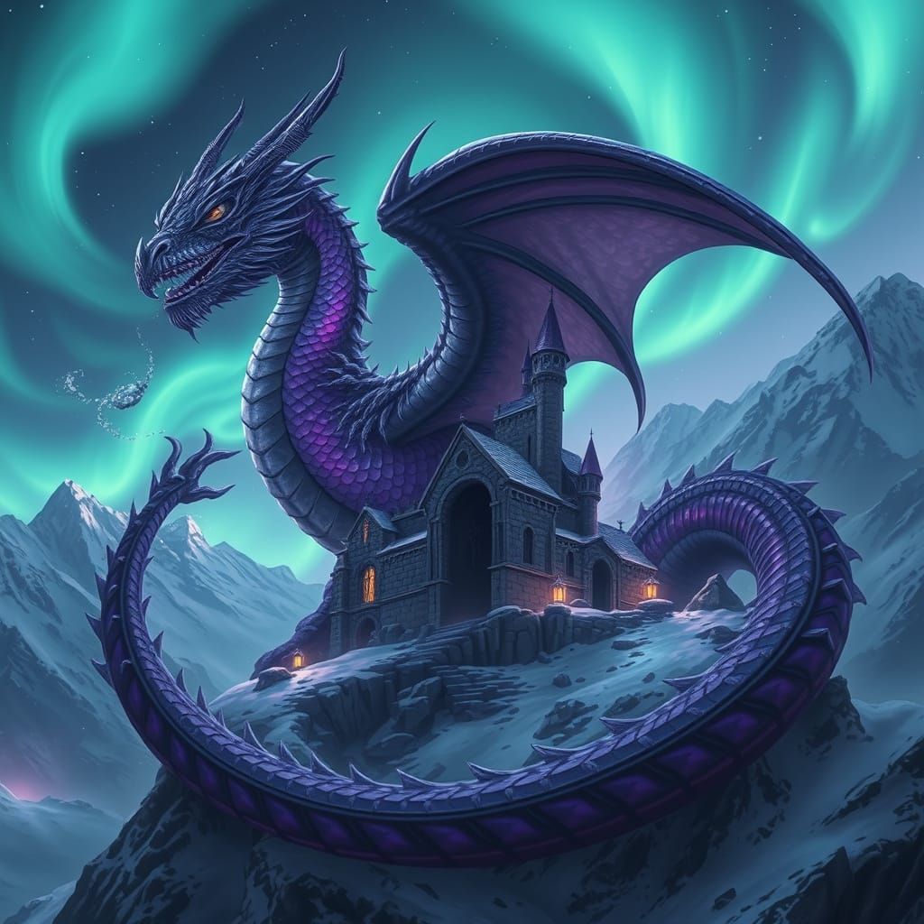 This image shows a gothic dragon with amethyst scales guarding a ruined castle on a snowy mountain. Auroras illuminate the scene, creating an atmospheric, cinematic fantasy artwork with intricate details and glossy textures.