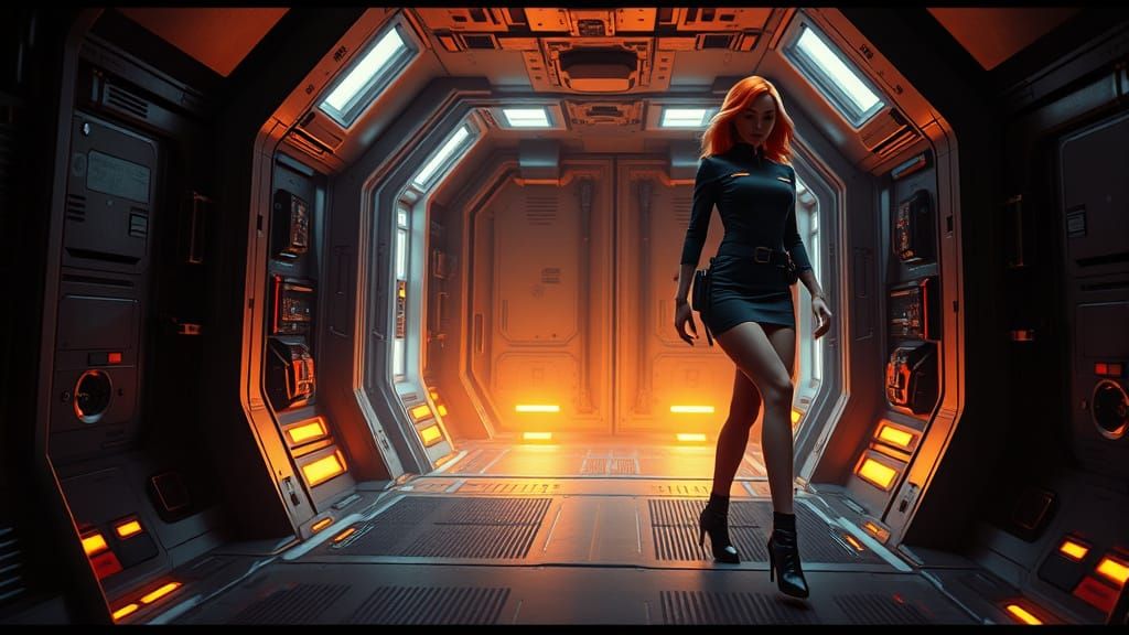This image captures a cinematic film still of two futuristic police women in navy blue uniforms, searching the dimly lit cargo area of a starship. The image features a gritty, high-tech aesthetic with a warm color palette and deep shadows, evoking a sense of tension and foreboding.