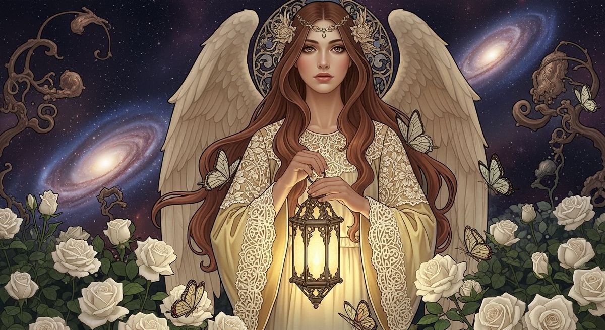 This image shows a beautiful auburn-haired angel with brown eyes and delicate wings in a serene rose garden. She holds a lantern, surrounded by butterflies against a dramatic star-filled sky, as an art nouveau painting.