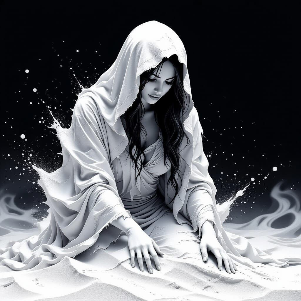 This image shows a high-definition black and white drawing of a ghostly woman in torn robes. The figure, composed of sand, is dissipating in the wind with 3D shading.