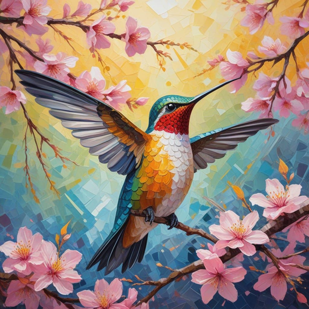 This stunning painting showcases a hummingbird amidst vibrant cherry blossoms in a rich, Impressionist style with thick, textured brushstrokes and warm, golden light.