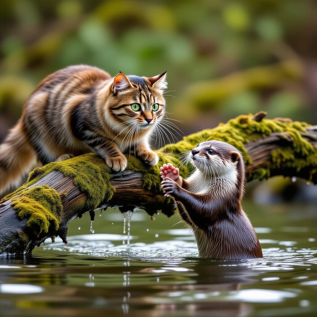 This image shows a mother cat running on a mossy branch towards an otter in the water who is presenting a kitten. Captured with shallow depth of field and natural light, resembling a DSLR photograph.
