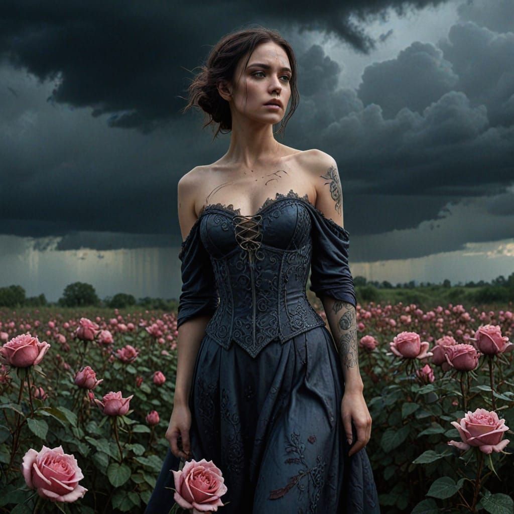 A hyperrealistic digital matte painting of a solitary woman with intricate dark fantasy tattoos in a field of decaying roses, under a stormy, moody sky.