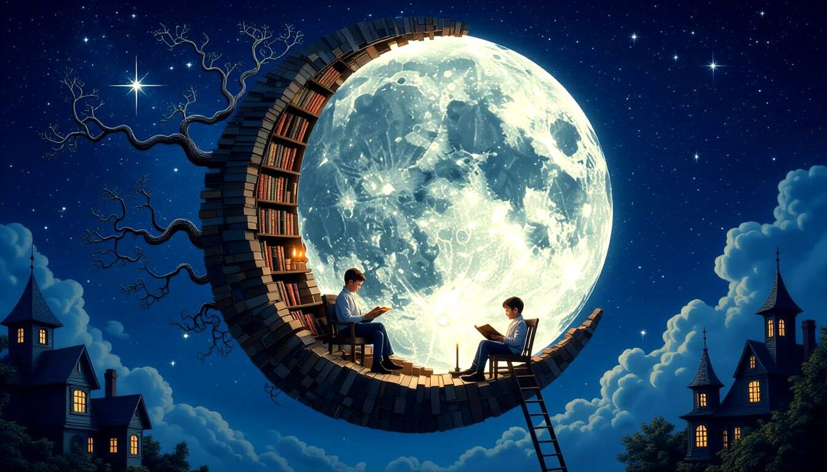 This image depicts a magical, intricate library constructed from a silver moon. A boy reads by candlelight amidst a fantasy scene with a ladder to the moon made of books, rendered in a surreal, enchanting style.