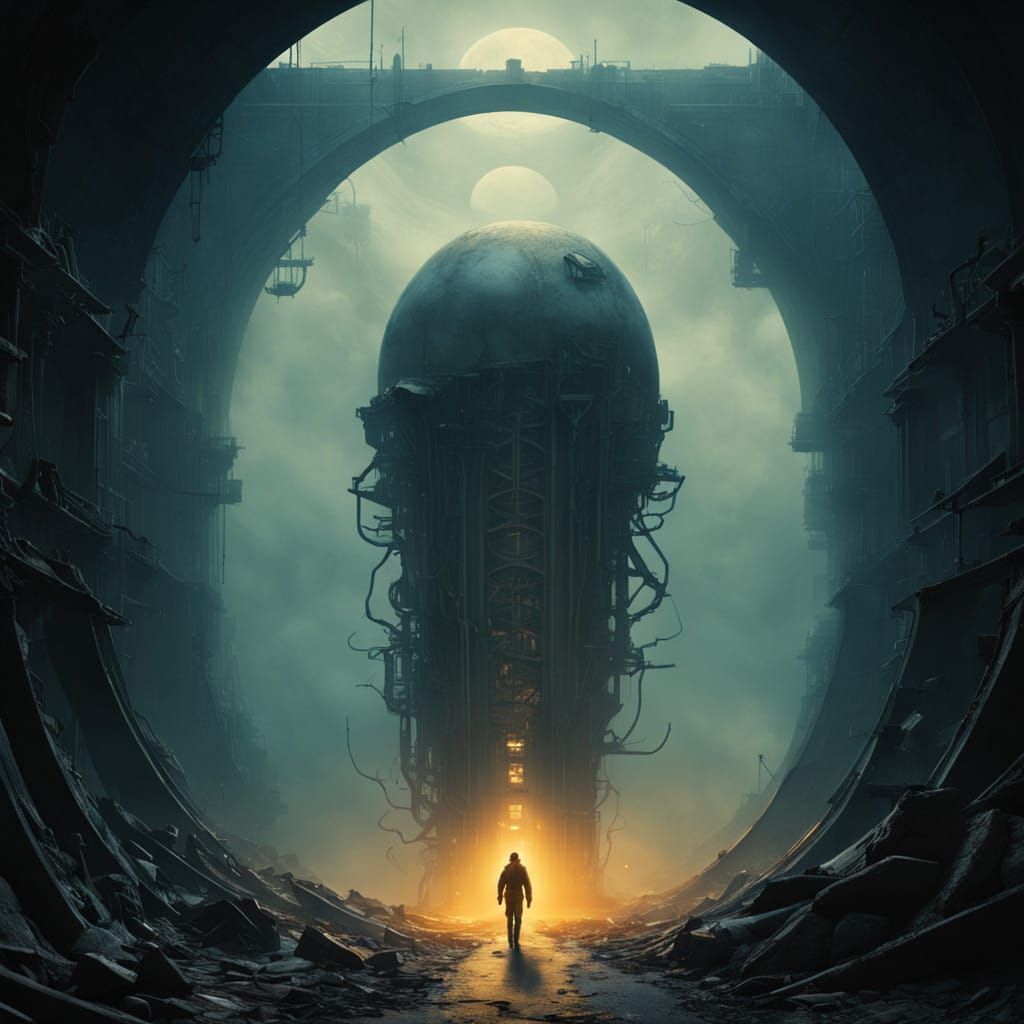 This image shows a large crowd of people with oversized brains emerging from the ground in a dark, post-apocalyptic tunnel. The scene is rendered with realistic and surreal elements as digital art.