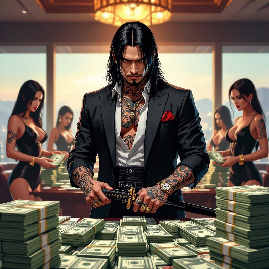 A young Yakuza boss with tattoos and a katana stands in a lavish penthouse surrounded by money. Rendered in a gritty, realistic style with dramatic lighting, evoking a high-stakes underworld.