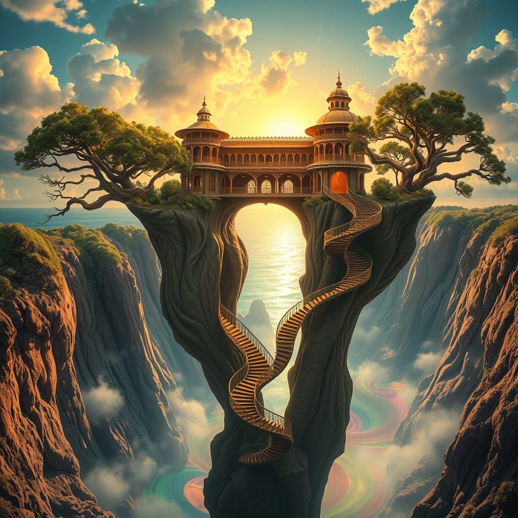 This image shows a majestic, weightless palace floating above the Seychelles islands, surrounded by a vibrant, swirling canyon of colors, reminiscent of a psychedelic dreamscape at dawn, with intricate, ornate details and impossible constructions.