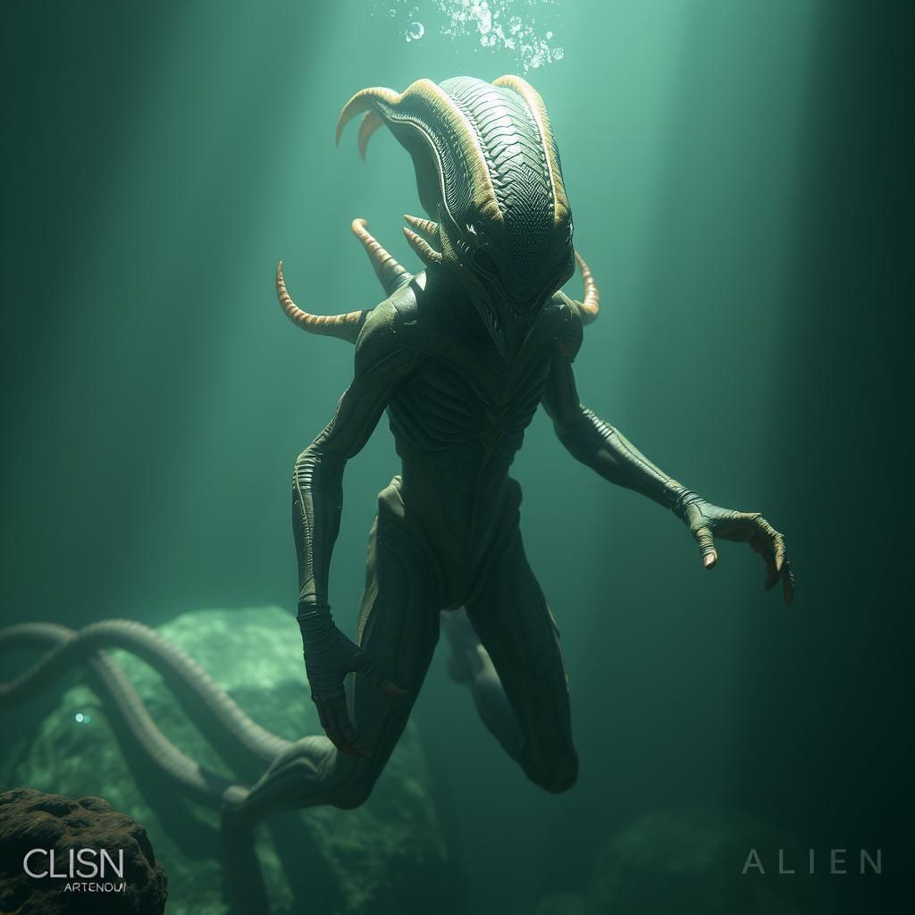 A 3D rendered image of an alien elf triton underwater. The image features dramatic shading and depth, reminiscent of artwork trending on Artstation.