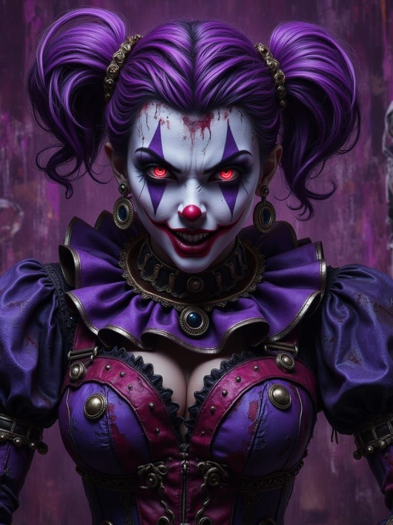 This image depicts an evil female clown with a sinister smile, featuring a purple and black color scheme and glowing red eyes. Blood streaks her face and costume, rendered in a detailed gothic horror illustration style with dramatic lighting.
