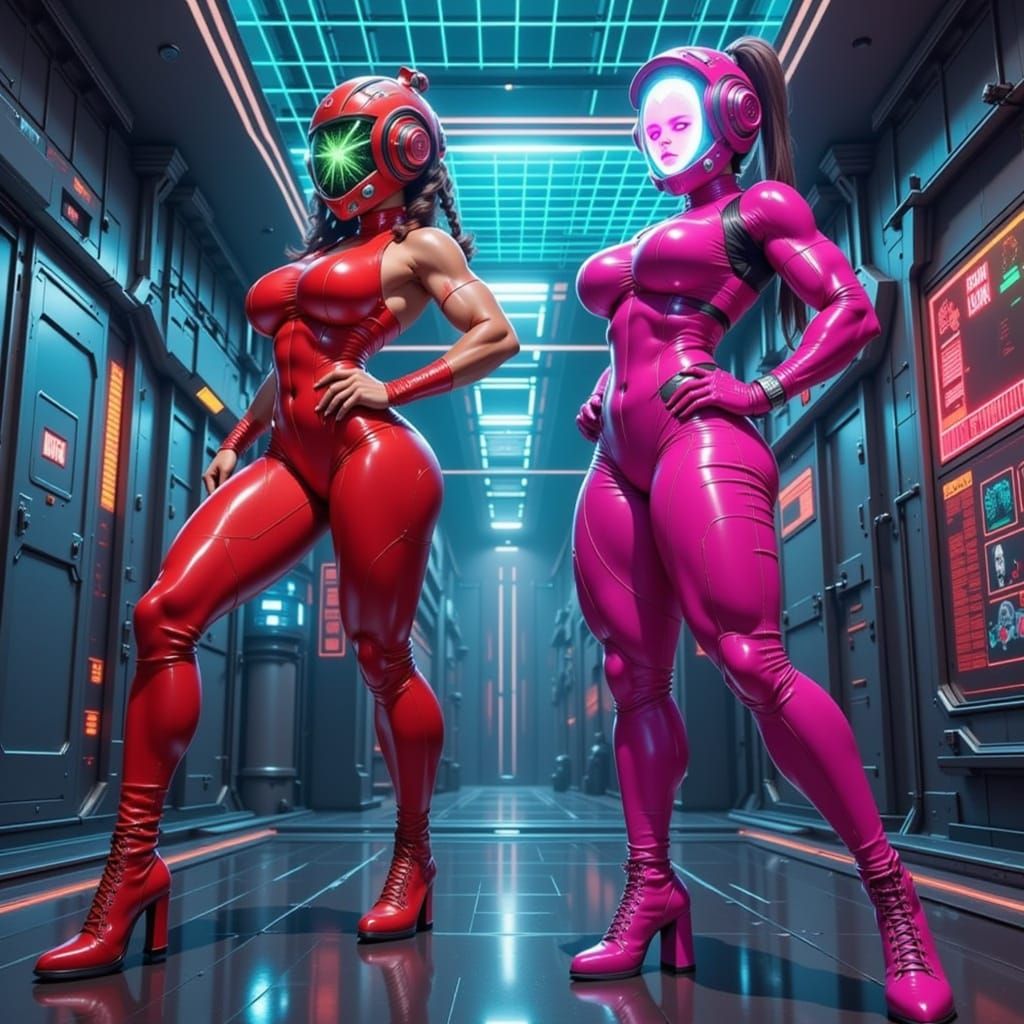 A striking picture of two futuristic female enforcers in a dystopian setting. One is in a red latex suit and the other in fuchsia armor, both with CRT monitor heads, under cinematic lighting in a vintage futurism style.