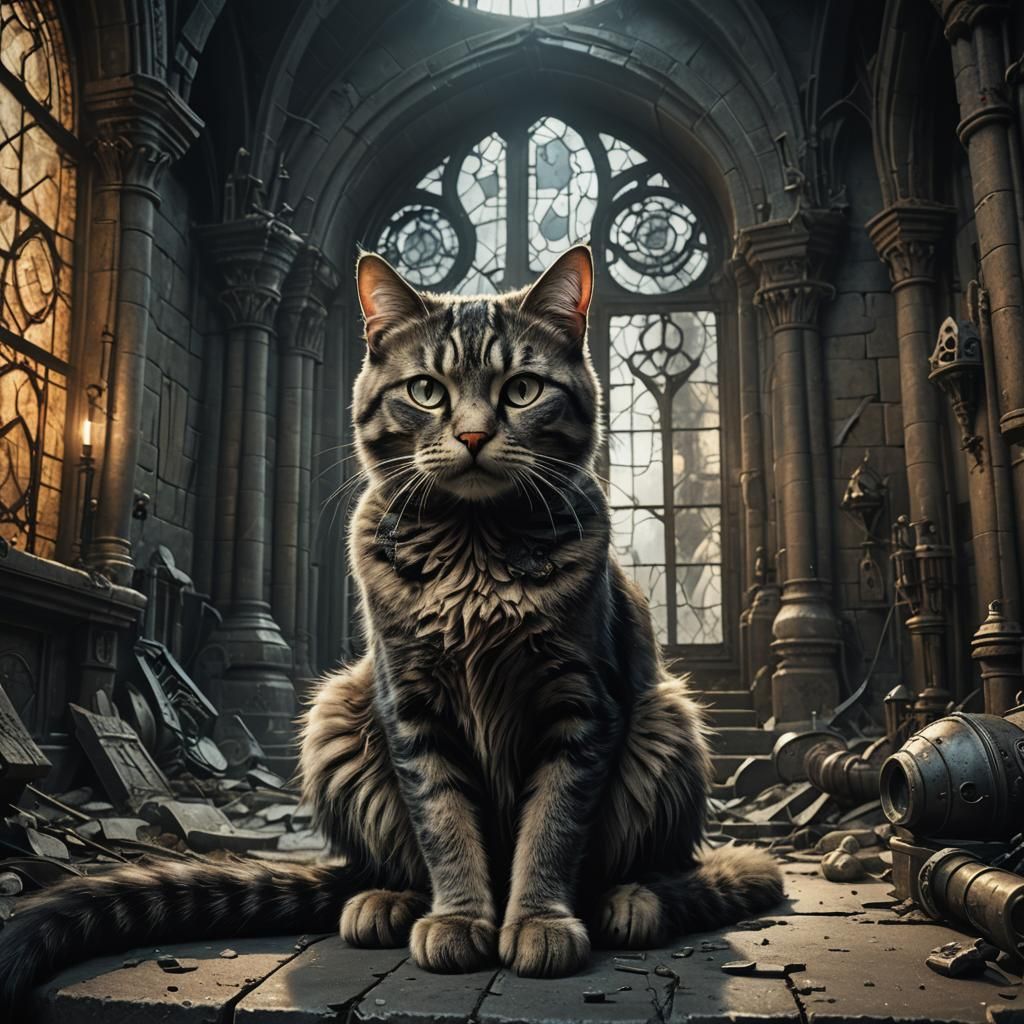 A dramatic digital painting of a mistreated cat in a gothic castle. The scene is bathed in colorful light filtering through stained glass, reminiscent of dark fantasy art.