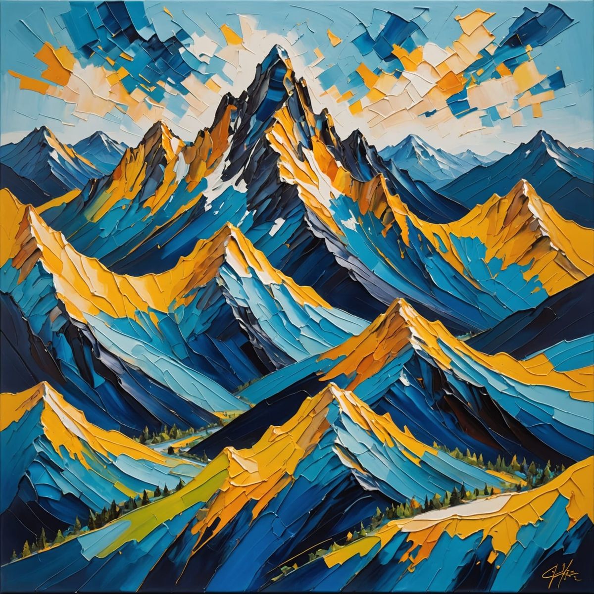 This image shows a vibrant, abstract mountain range with peaks made of thick, bold paint strokes. It features a swirling sky and palpable textures, evoking expressive impasto art with a surreal feel.