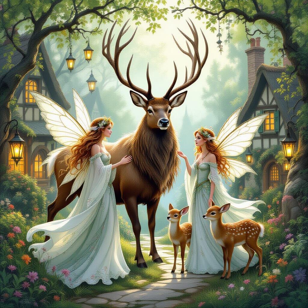 A whimsical fairy village scene featuring a stag family and fairies in flowing garments. The image has intricate details and ethereal light, resembling fantasy art.