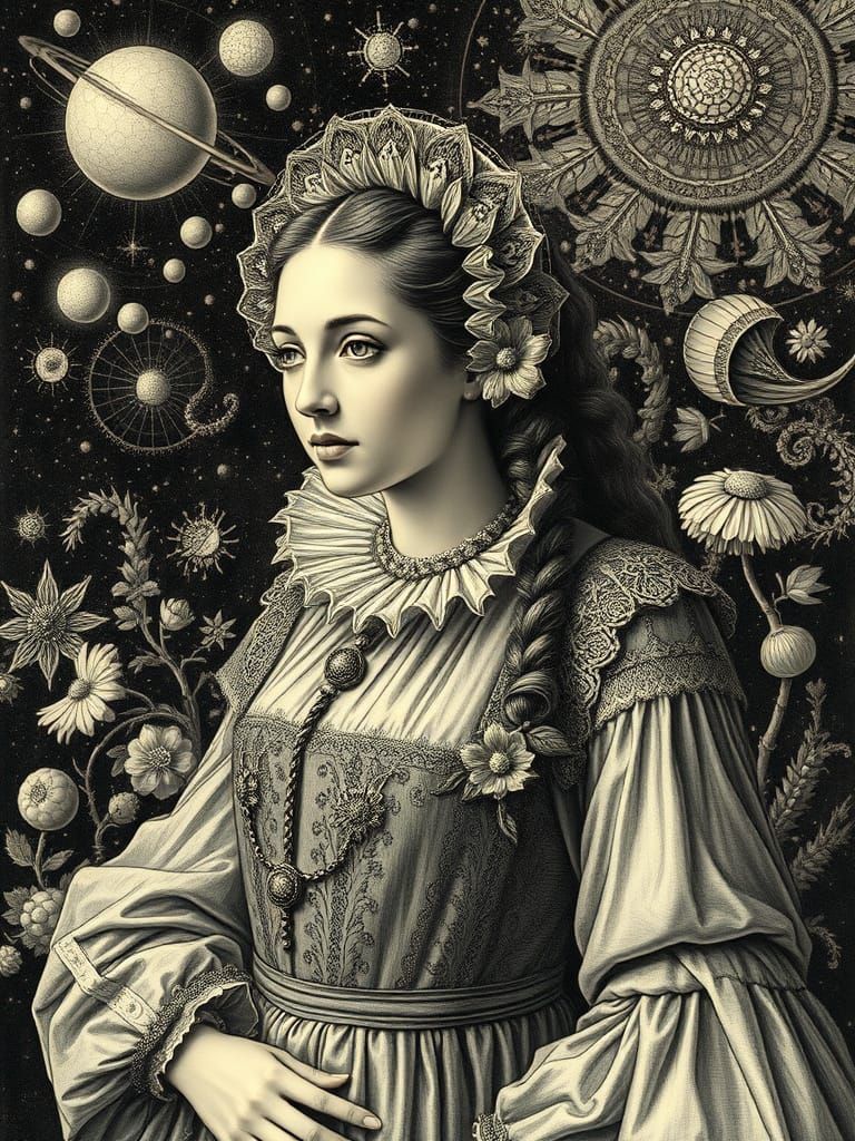 A surreal portrait of a woman in 17th-century clothing, seamlessly integrated with celestial and microscopic elements. The artwork features organic forms and intricate, whimsical details.