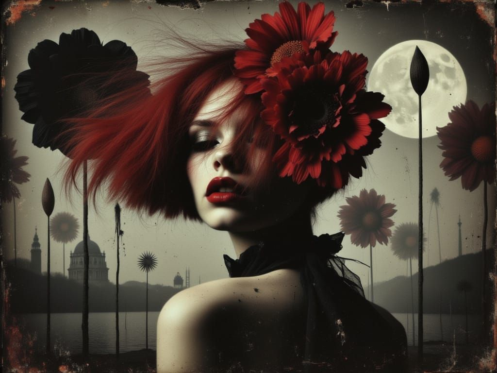 A delicate, ethereal young Gothic woman with red hair in haute couture, amidst a dark fairytale circus carnival with oversized blooms and blurred movement.