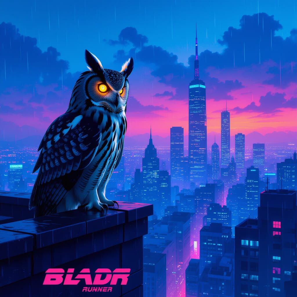 A reimagined Blade Runner movie poster featuring a cybernetic owl on a neon-lit rooftop overlooking a dystopian city. The art blends film noir and cyberpunk aesthetics with a textured, painterly finish.