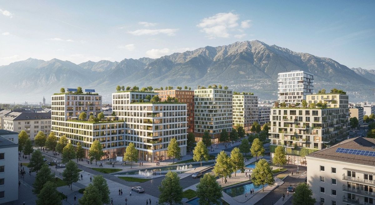 A cinematic visualization of a sustainable city in Innsbruck, Austria, featuring modern social housing with green facades and rooftop gardens against the Tyrolean mountains, rendered with parametric and minimalist architectural influences.