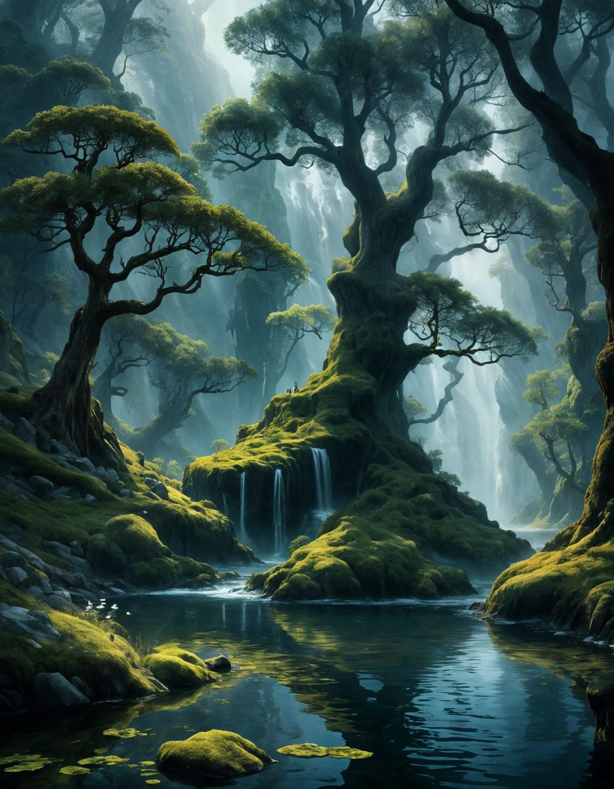 A fantasy landscape showcasing water and trees in a minimalist style. The image evokes the ethereal qualities of classical landscape paintings, with a focus on light and atmosphere.