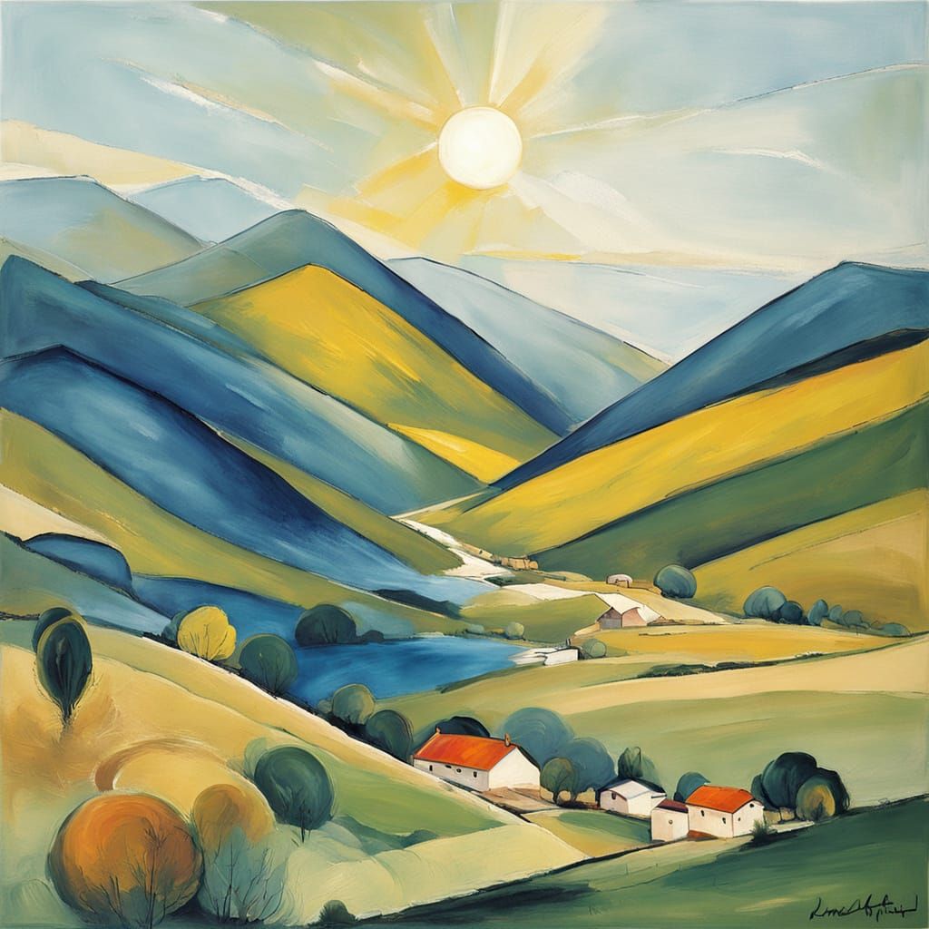 A close-up landscape painting of a mountain and river in soft light. The artwork showcases green tones, blue shadows, warm colors, atmospheric effects and fine lines in an impressionistic style.