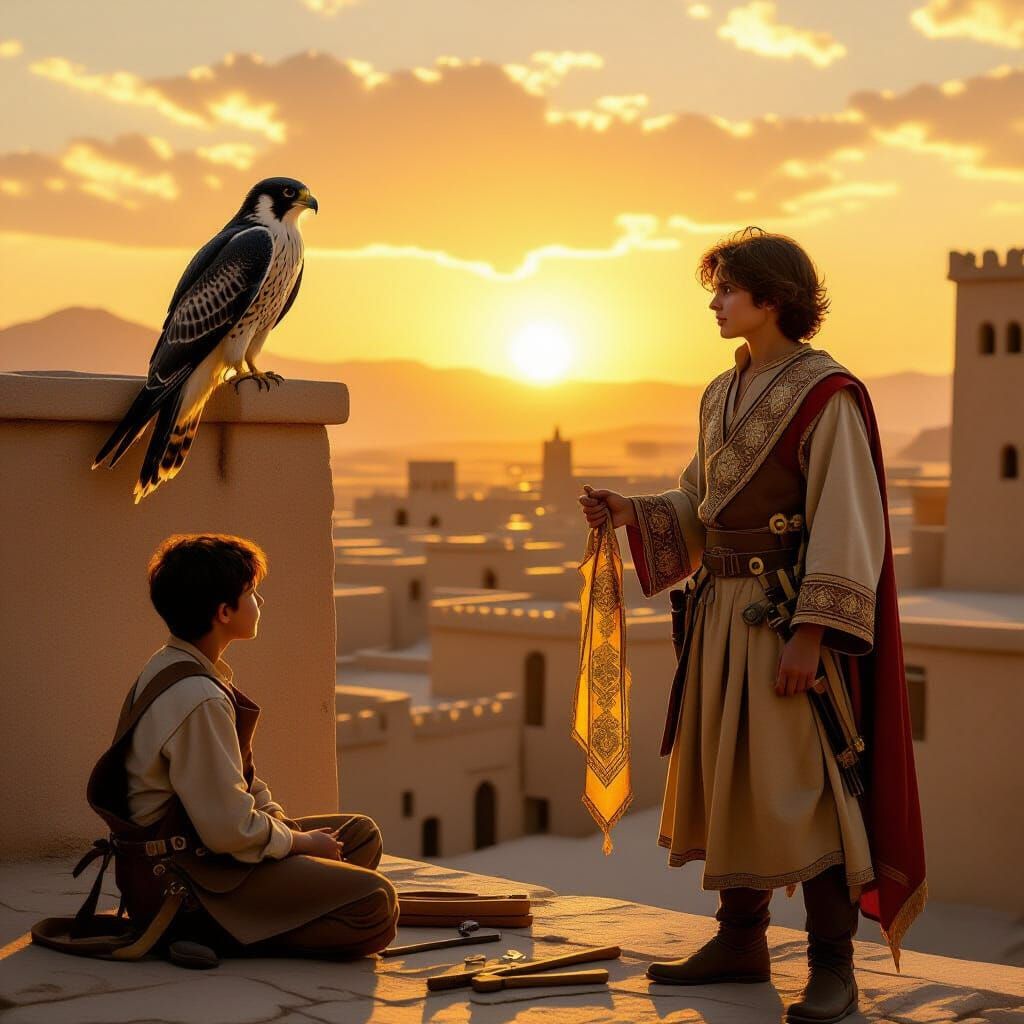A desert city courtyard scene at sunset with a falcon perched on a rooftop, clutching a sash. A carpenter and a prince observe the scene. Evokes fantasy concept art with matte painting and deep colors.