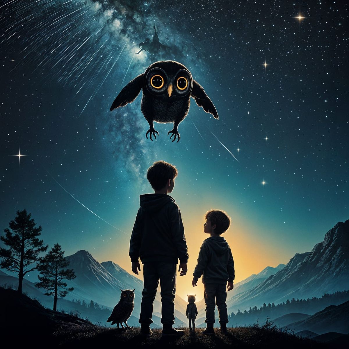 This vintage illustrated poster reimagines E.T. with a boy and a glowing owl reaching out under a starry sky. Features warm lighting and subtle glitch art details for a nostalgic feel.