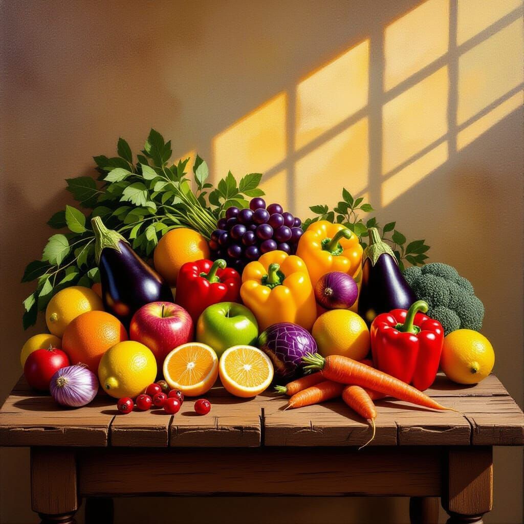 This image shows an artful arrangement of fresh fruits and vegetables on a rustic table, bathed in golden hour light. Rendered in a hyperrealistic oil painting style with rich colors.