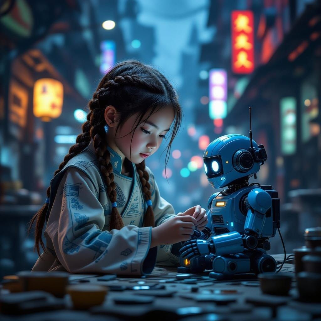 This image shows a young girl in a sci-fi tunic fixing a blue robot in a workshop. A blurred, neon-lit cityscape creates a futuristic atmosphere with dramatic lighting.