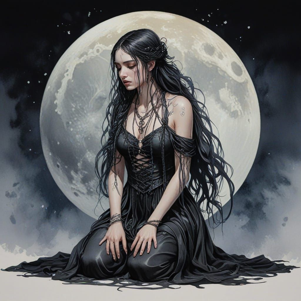 A sorrowful goth girl kneels under moonlight in this image. The watercolor artwork features intricate details and flowing braided hair, rendered in a stylized manner.