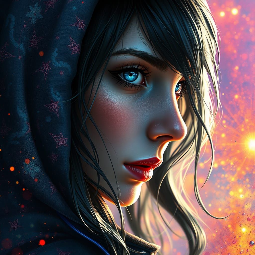 A vibrant digital artwork showcasing a detailed silhouette of a mystic girl. The piece emphasizes color depth and intricate details with a hyperrealistic, dramatic aesthetic.