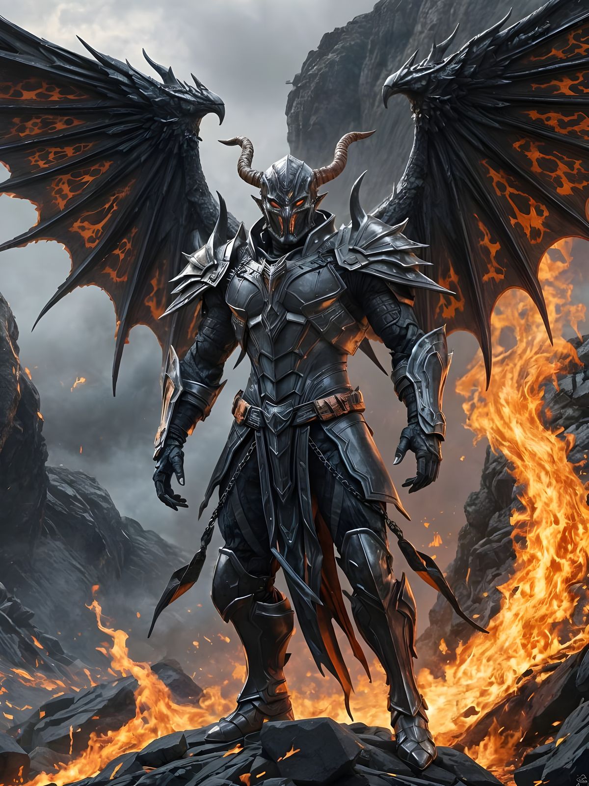 This image shows a heavily armored, winged demon figure wreathed in flames standing in a volcanic landscape. The artwork is a stylized, high-contrast medieval fantasy illustration.