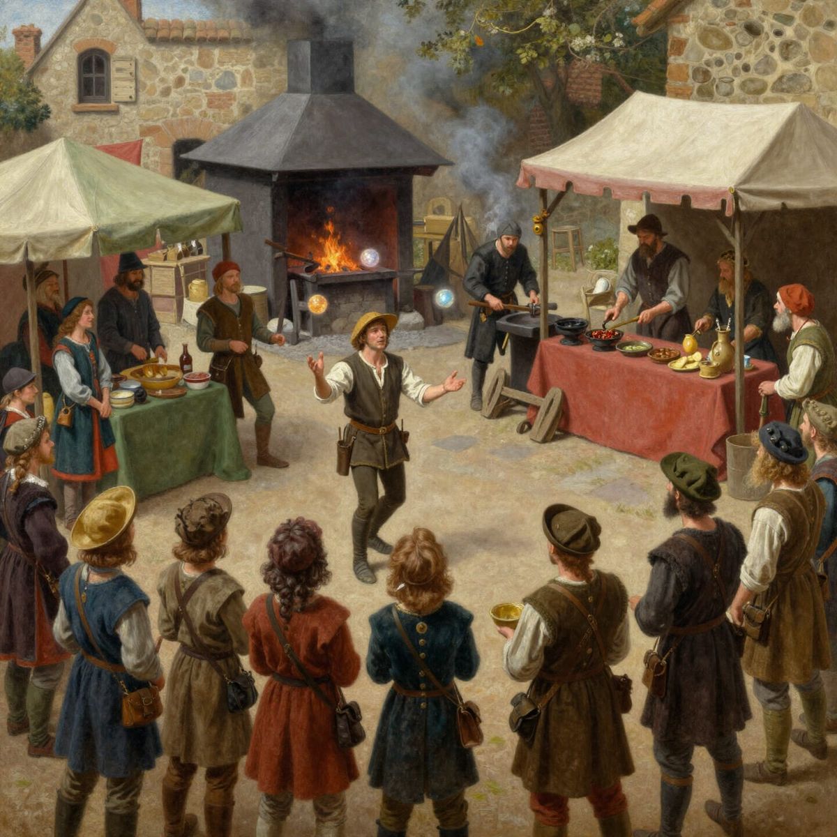 A vibrant medieval marketplace bustling with activity. A street performer juggles glowing orbs as onlookers watch, with a blacksmith and merchants nearby. Rendered as a detailed, realistic oil painting.