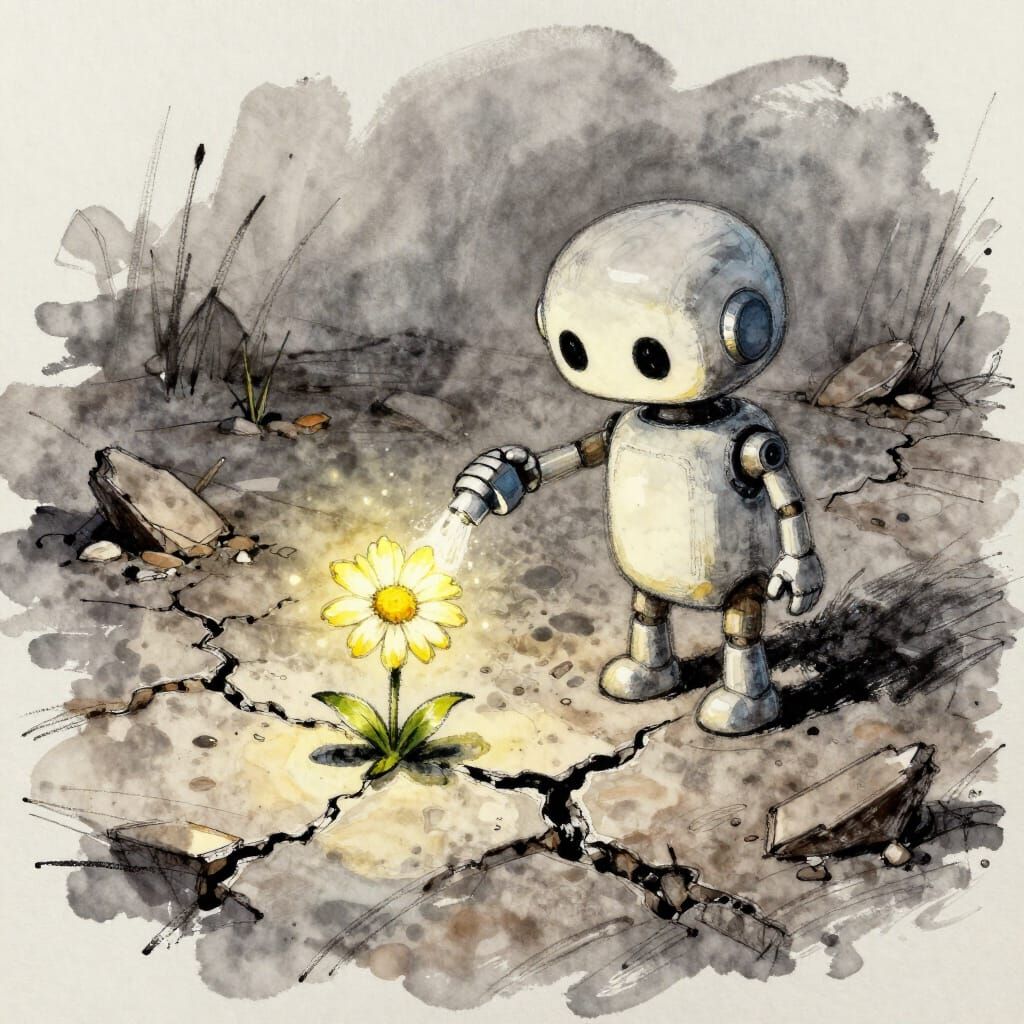 This image shows a small robot watering a single luminous flower emerging from cracked pavement. Rendered in a watercolour expressionist style with charcoal sketch elements.