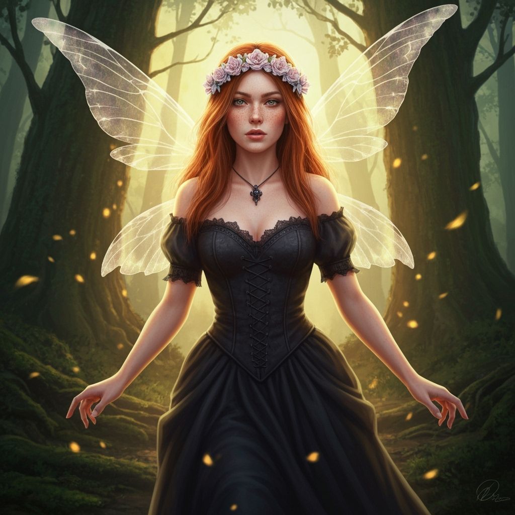 This image shows a hyper-realistic gothic fairy with copper hair and freckles, adorned with a floral tiara and dark dress. Her shimmering wings catch golden light in an ancient forest. Rendered with vivid colors and dynamic lighting.