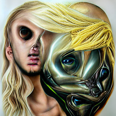 This image shows a stunning, hyperrealistic artwork of a blonde-haired hybrid being, blending human and alien features in intricate detail. The image is rendered in high-resolution 8k.