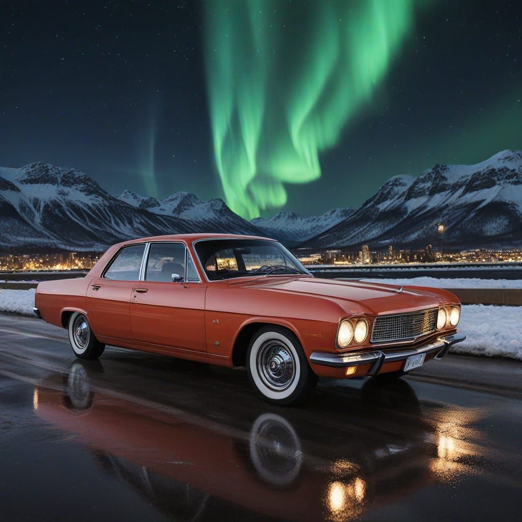 This image showcases a classic automobile against a backdrop of a high-tech metropolis illuminated by the vibrant colors of the northern lights.