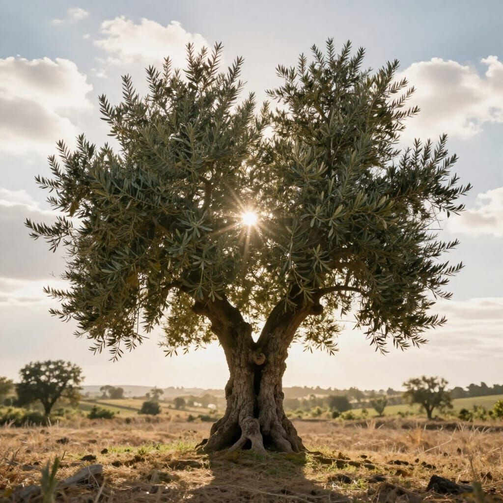 This image shows a mature olive tree with visible branches rooted in a landscape. Warm, soft-focus sunshine filters through subtle clouds, creating a peaceful and trustworthy atmosphere in a realistic style.