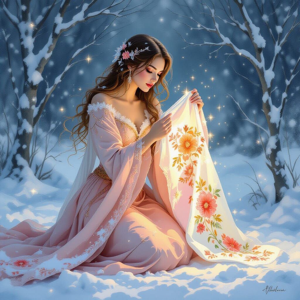 This image shows a woman kneeling in a blizzard. She is holding a glowing cloth, and the snow around her is turning into crystallized petals, rendered in watercolor and ink with delicate precision.
