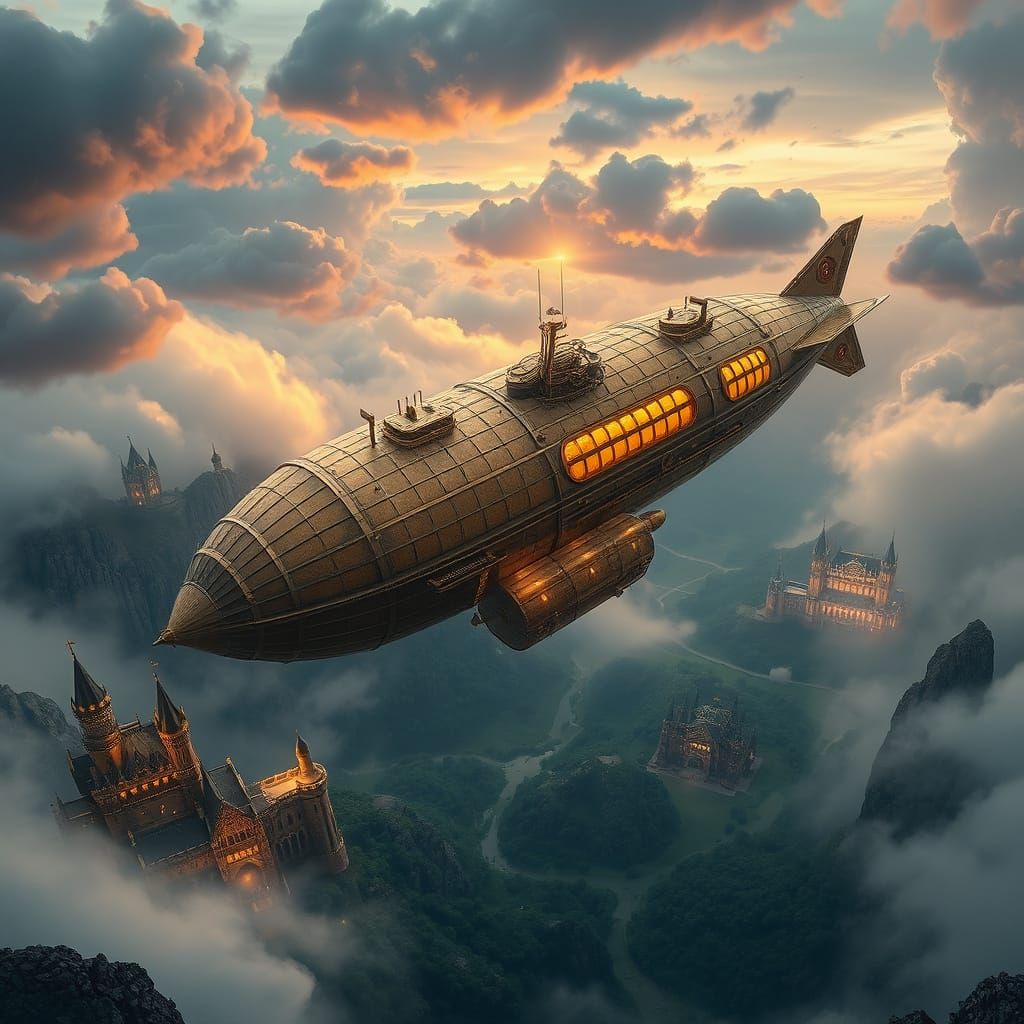 This image shows a large steampunk airship gracefully soaring through a misty, mountainous landscape. The vintage airship features brass details and glowing windows, set against a dramatic, cinematic backdrop of rich colors and swirling clouds.