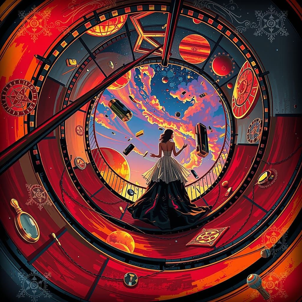 This image shows a woman in an Art Deco gown on a spiral staircase reaching into a colorful sky. Enigmatic symbols float around her, all rendered with hyperrealistic detail.